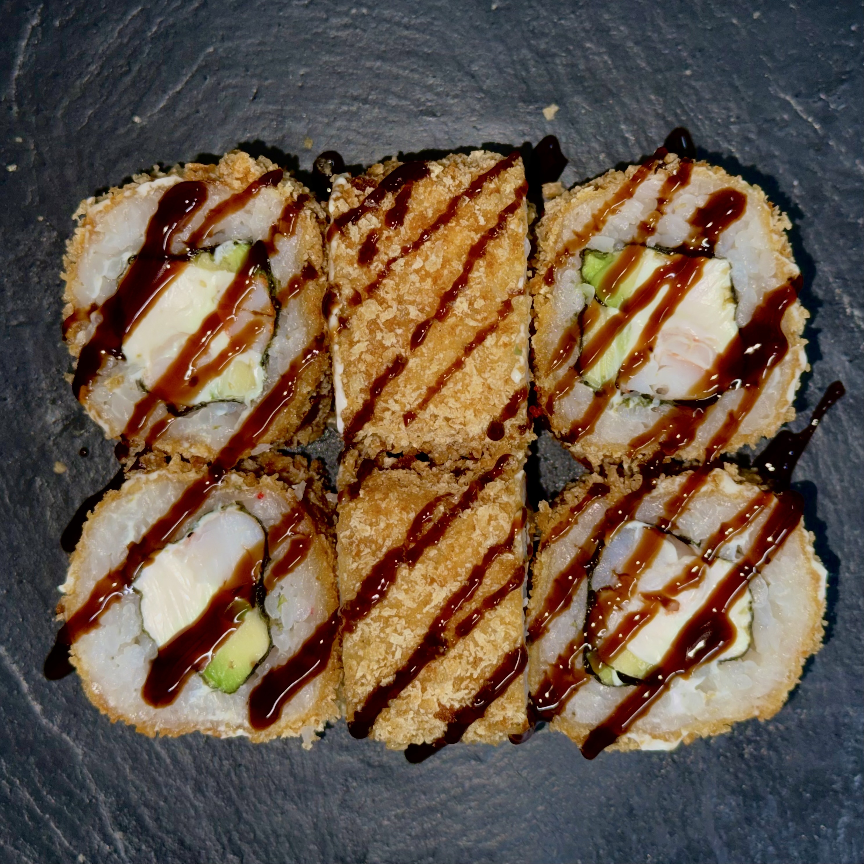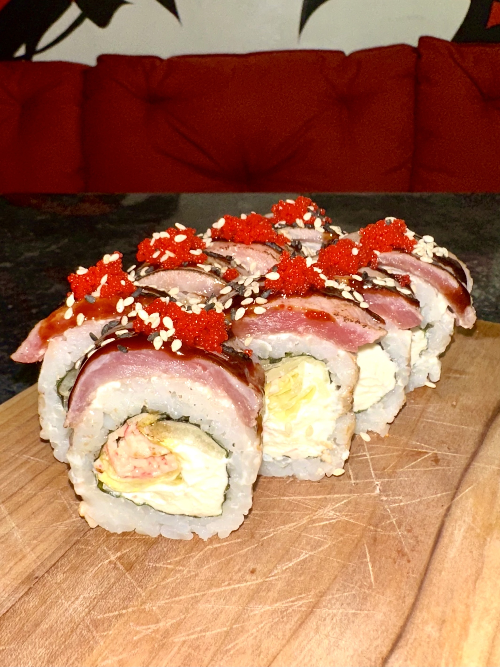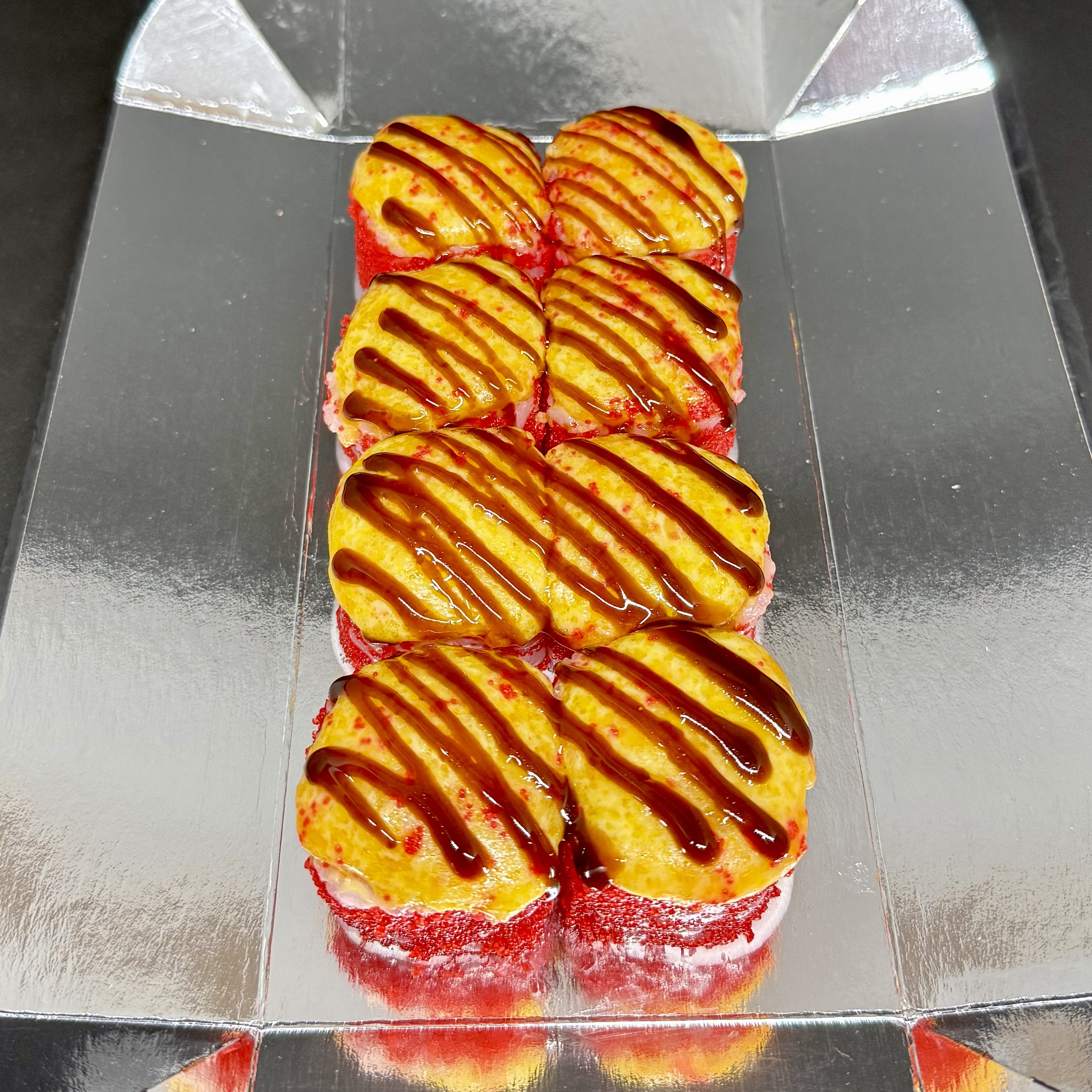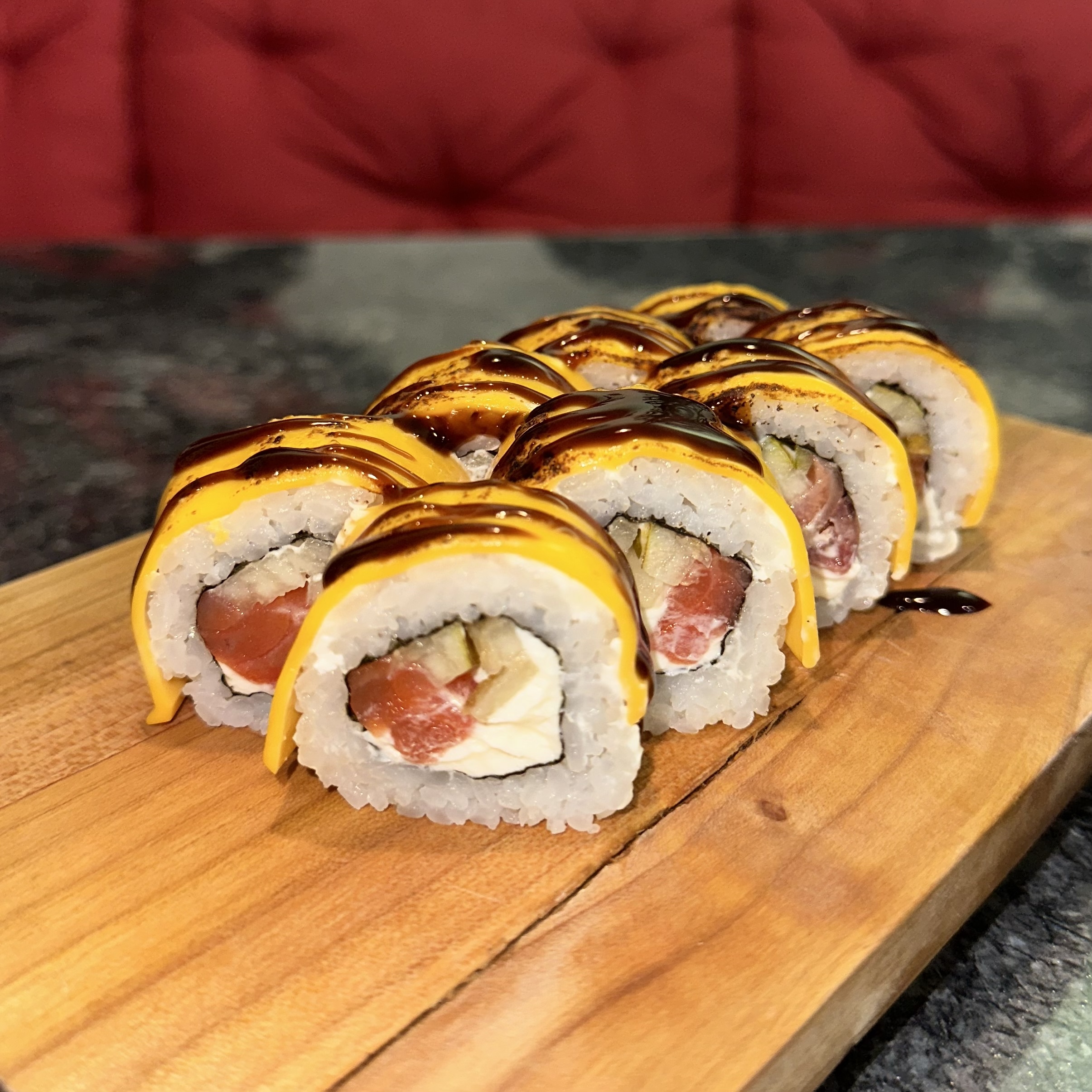 • Крем-сир• Філе тунця• Креветки• Авокадо• Чорнила каракатиці• Ікра летючої риби• Соус Спайсі