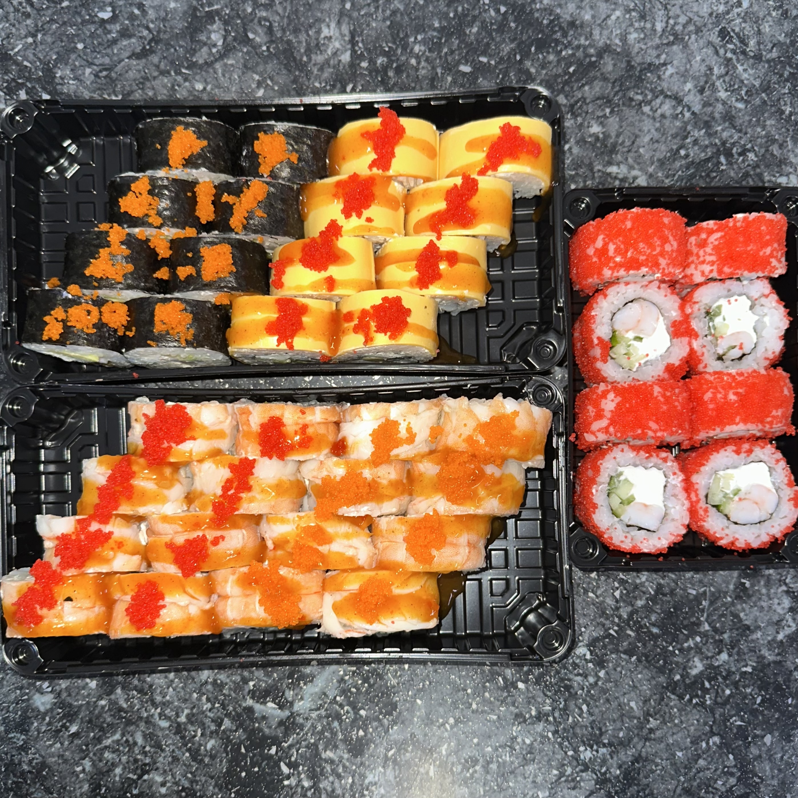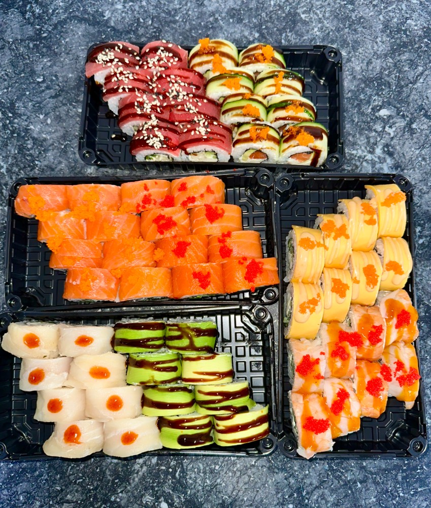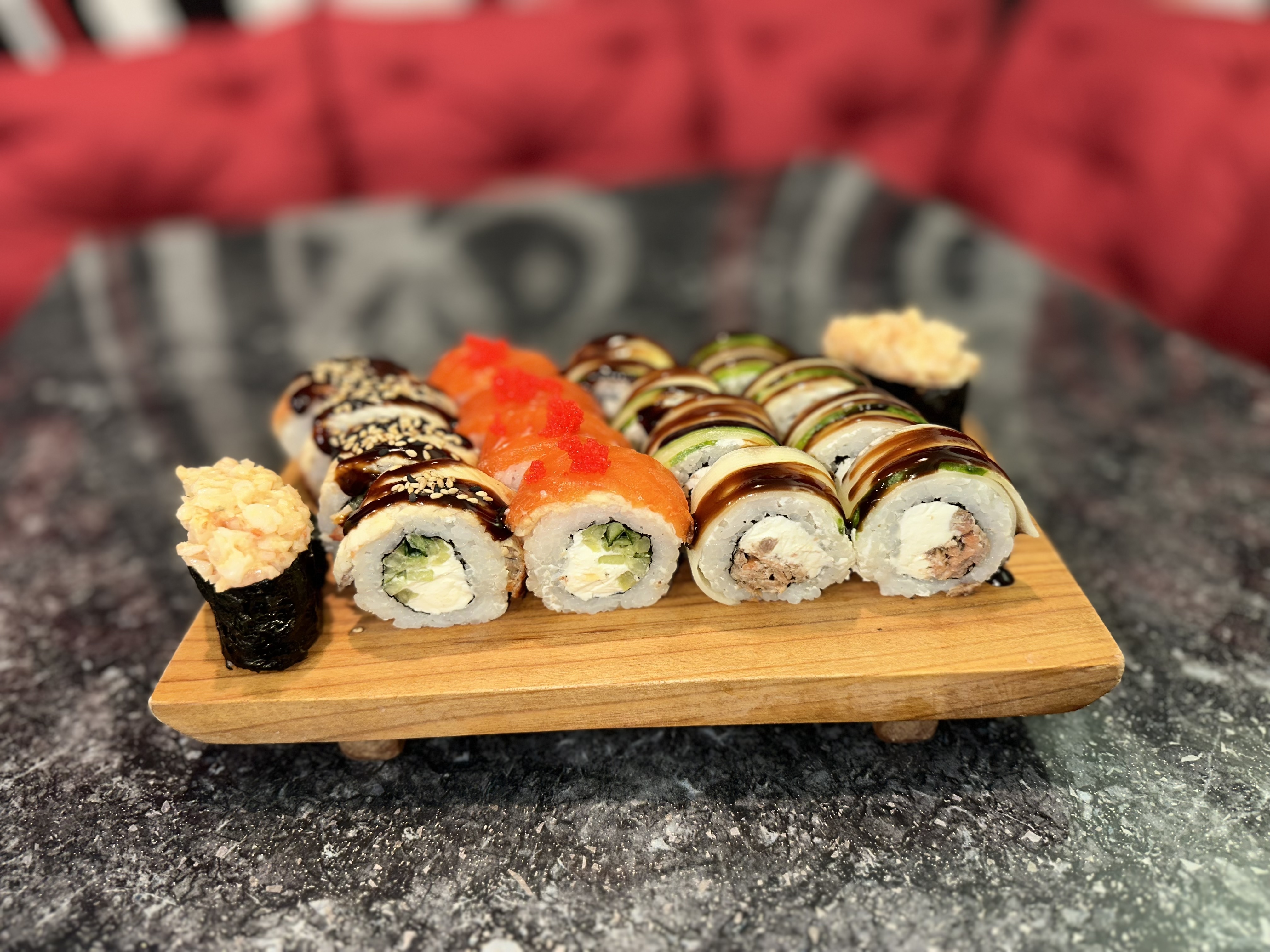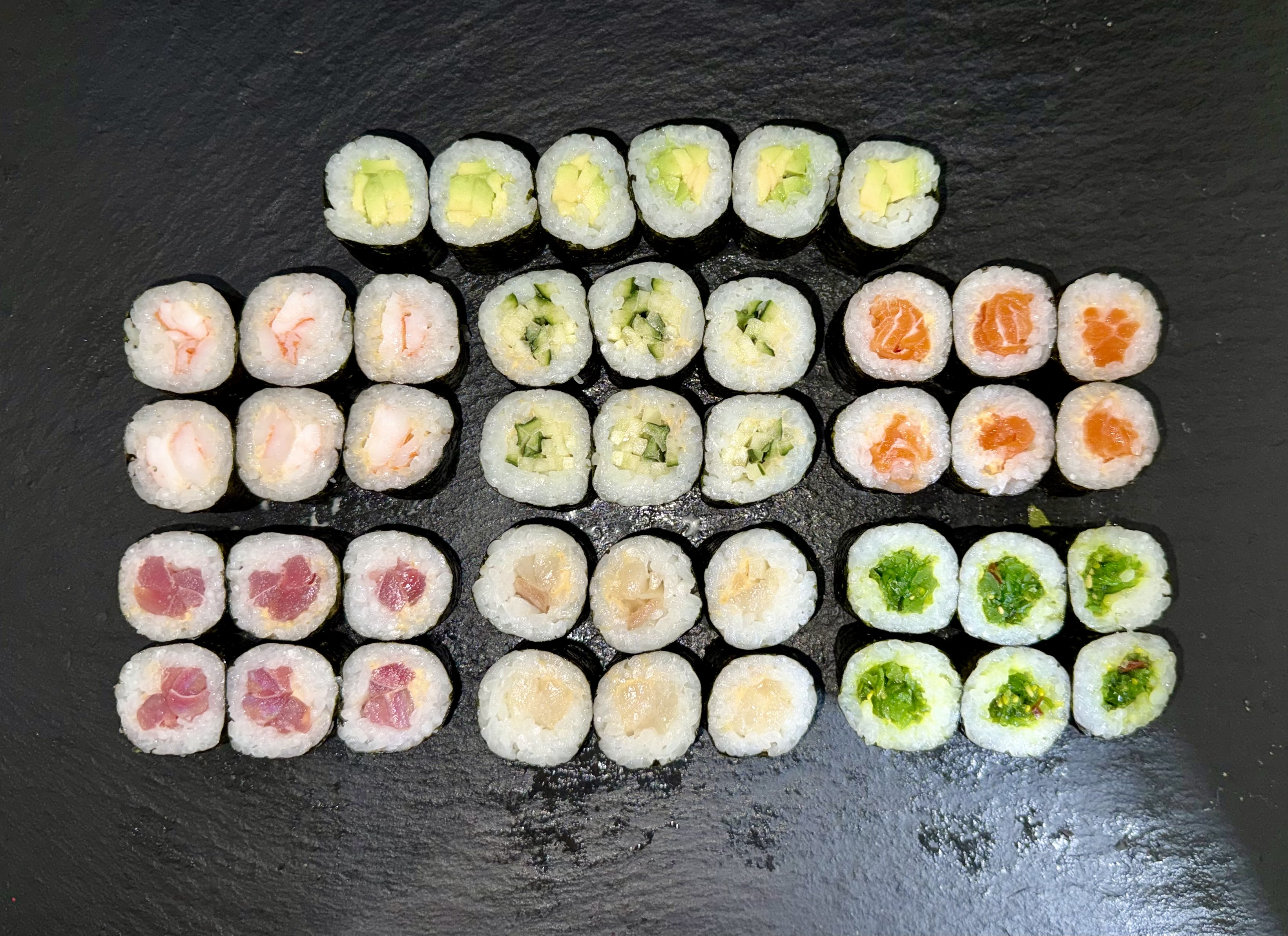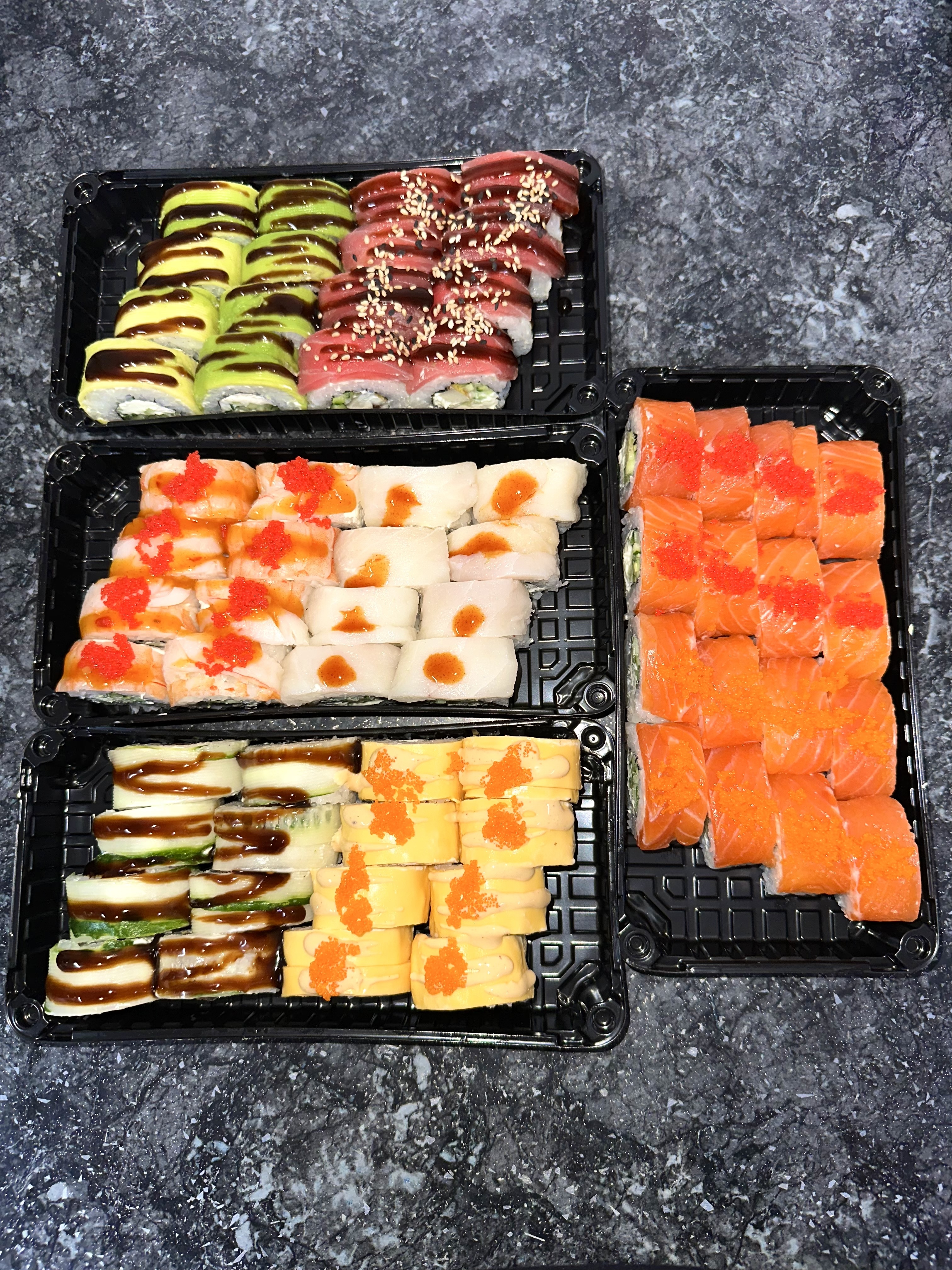 Складається з макі ролів з лососем, тунцем, авокадо, креветками, масляною, огірками та чукою.