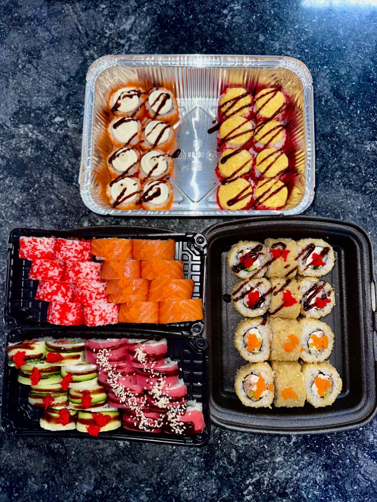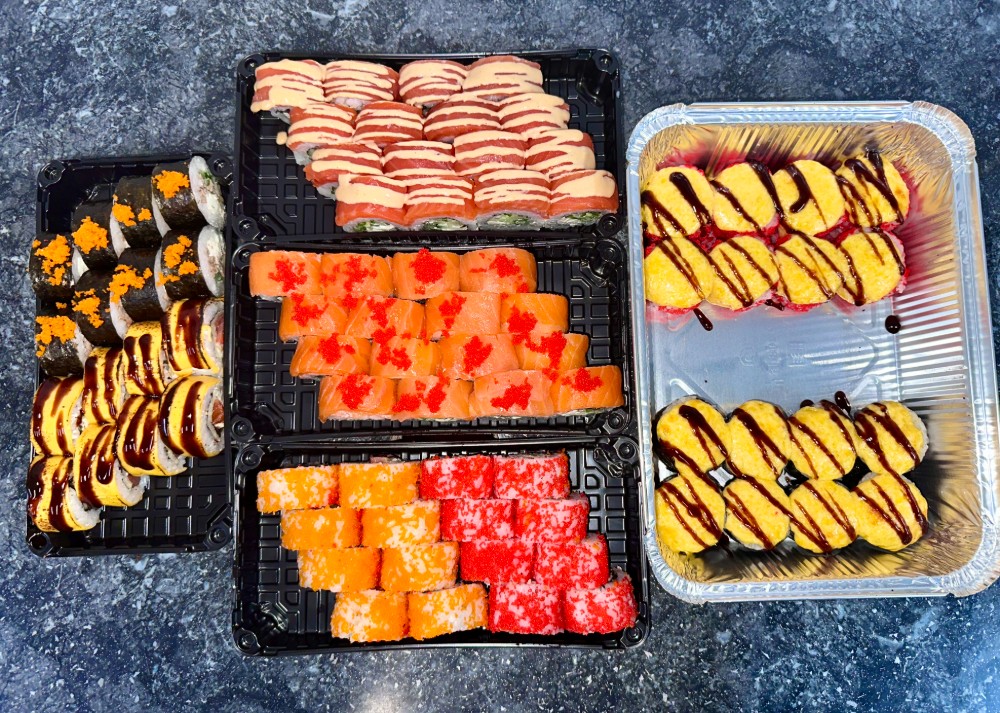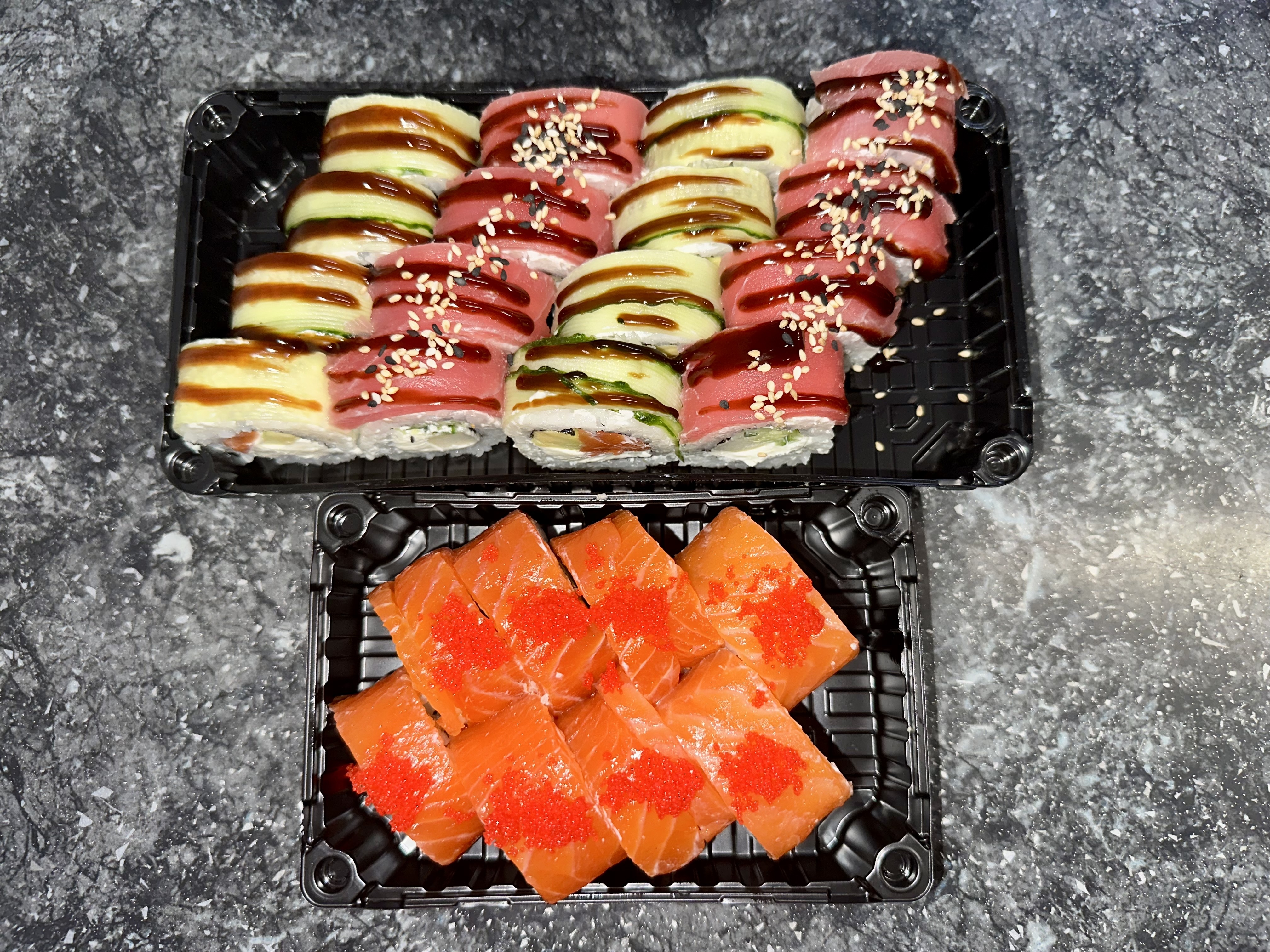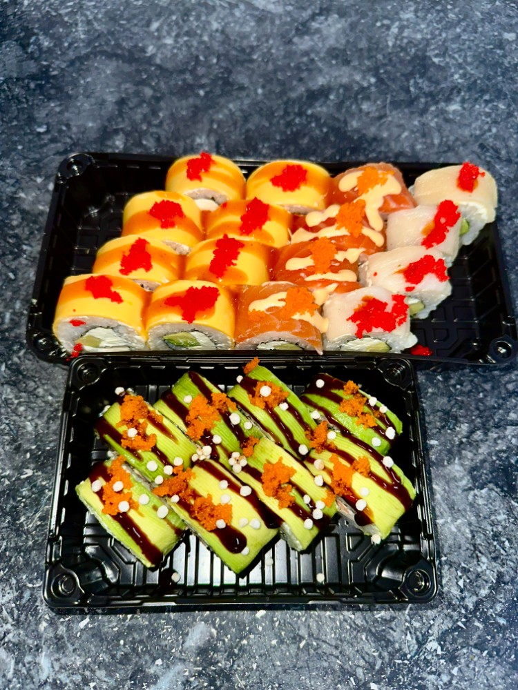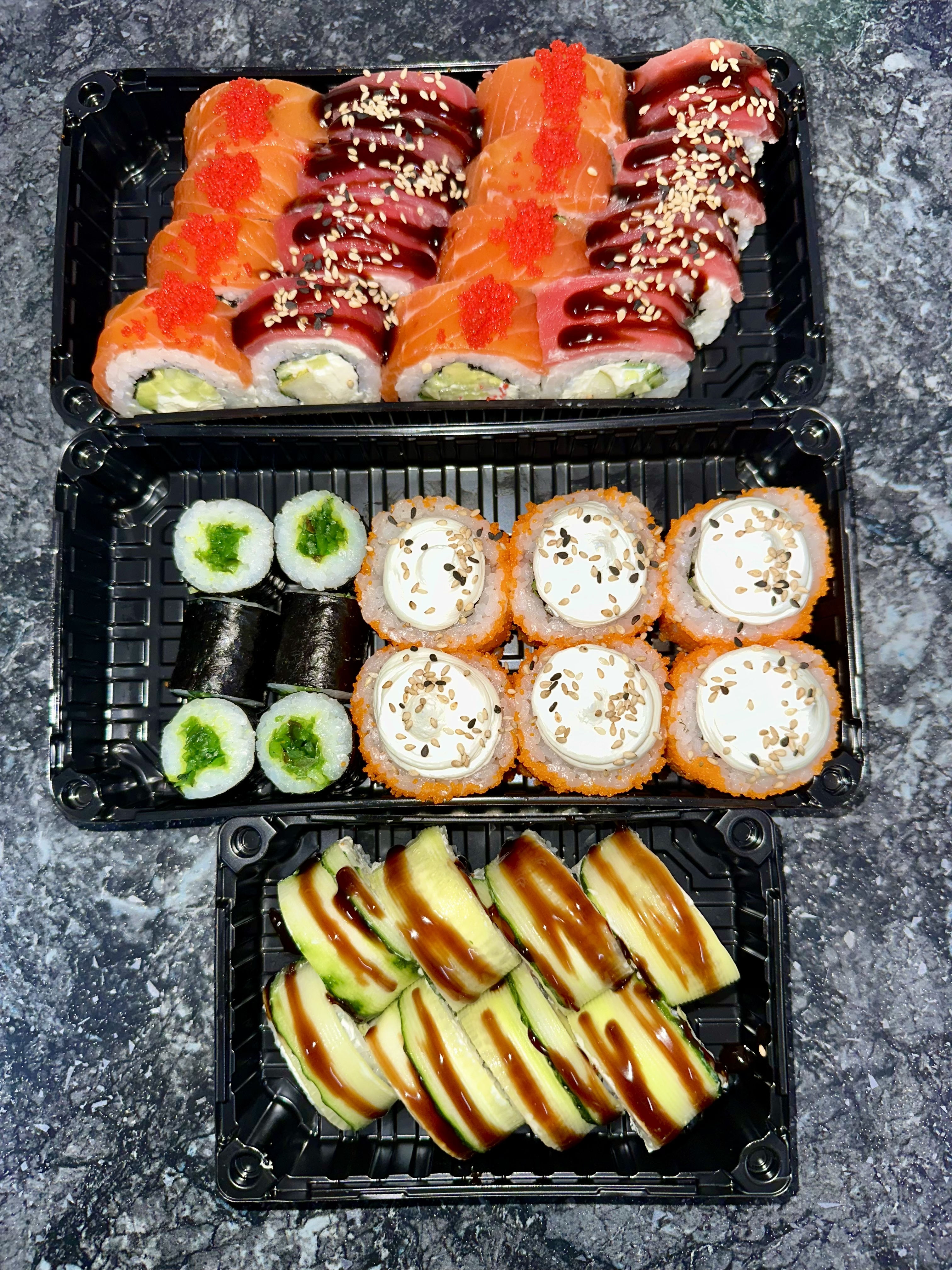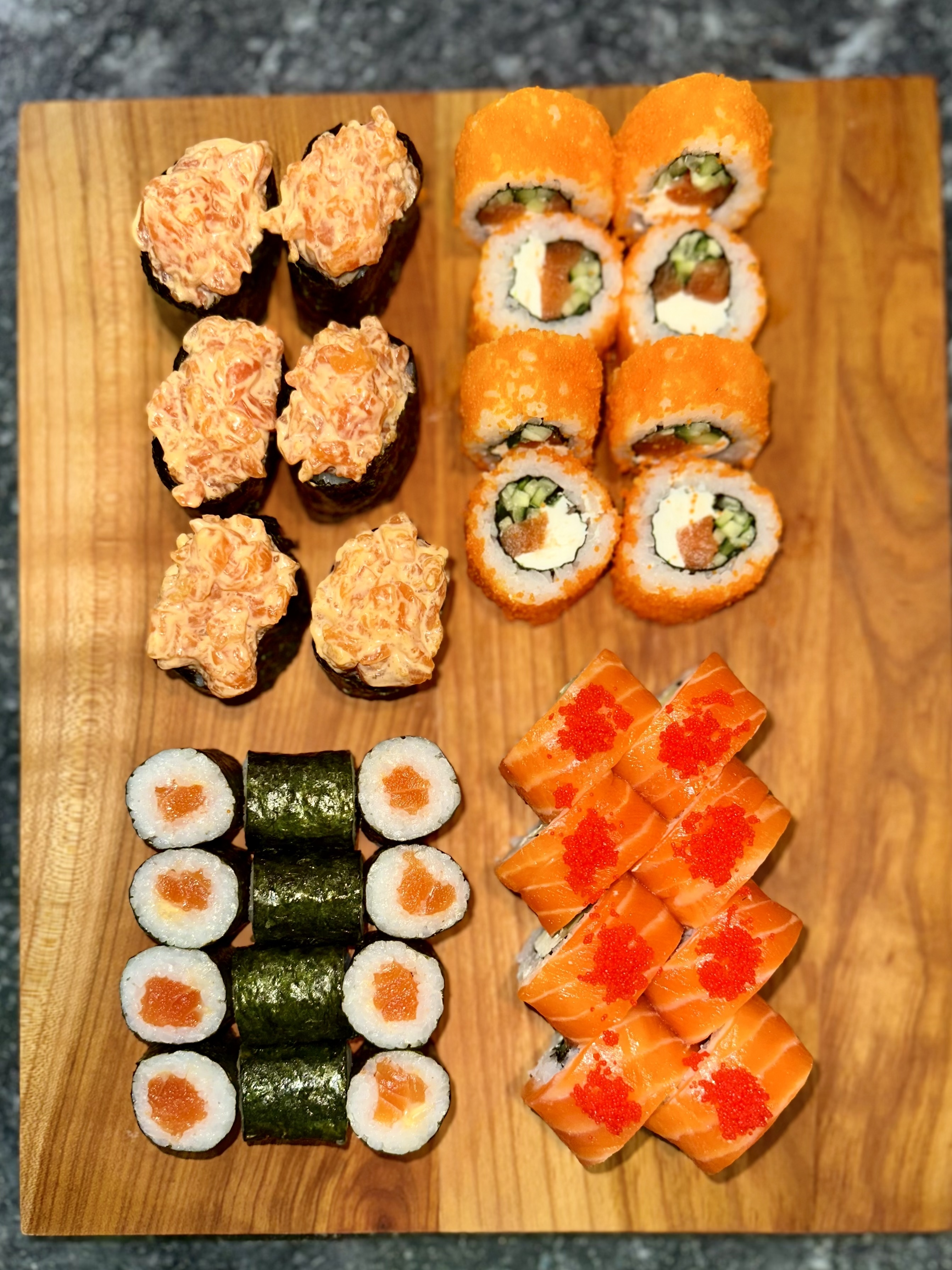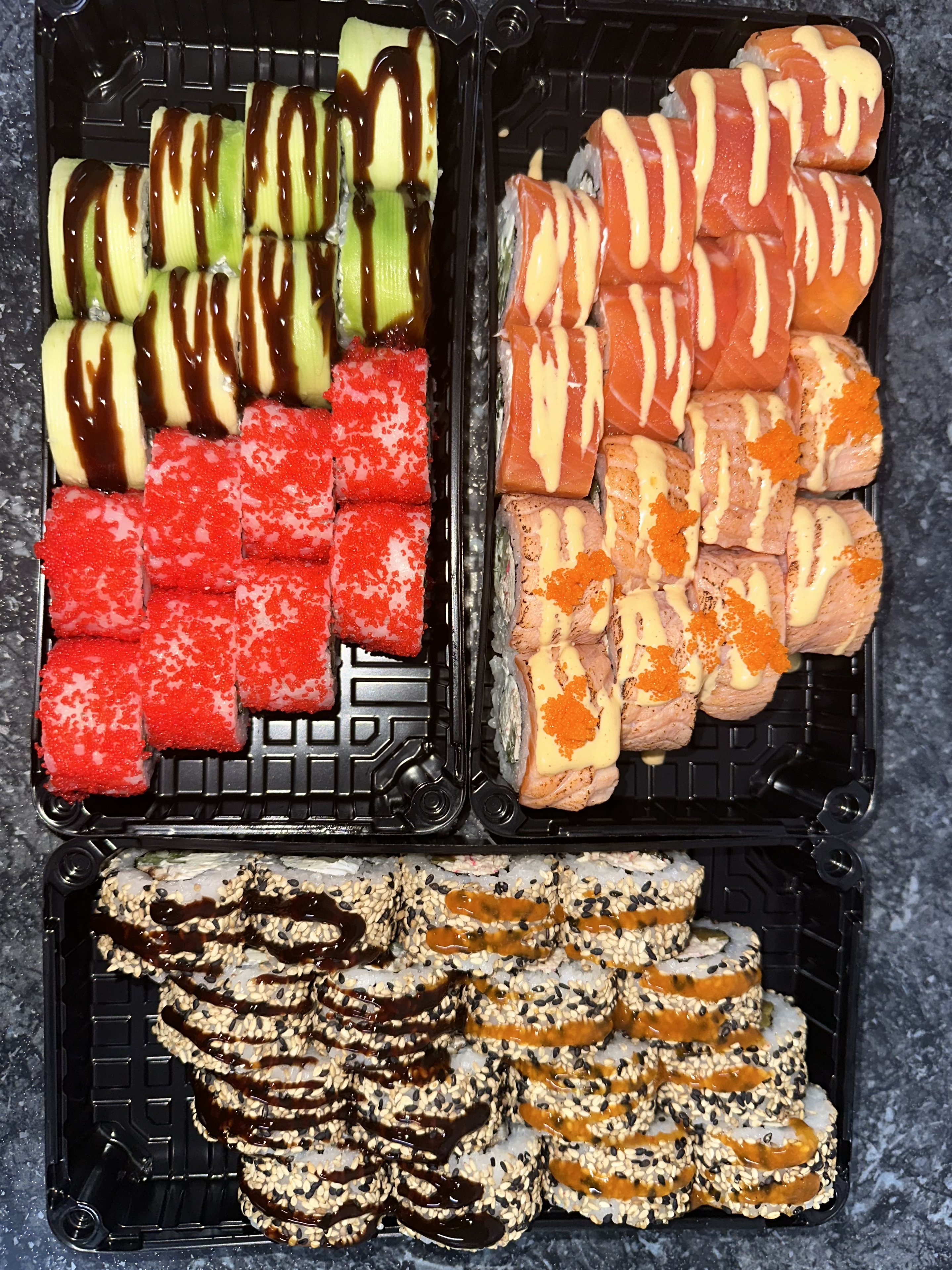 Складається з макі ролів з лососем, тунцем, авокадо, креветками, масляною, огірками та чукою.