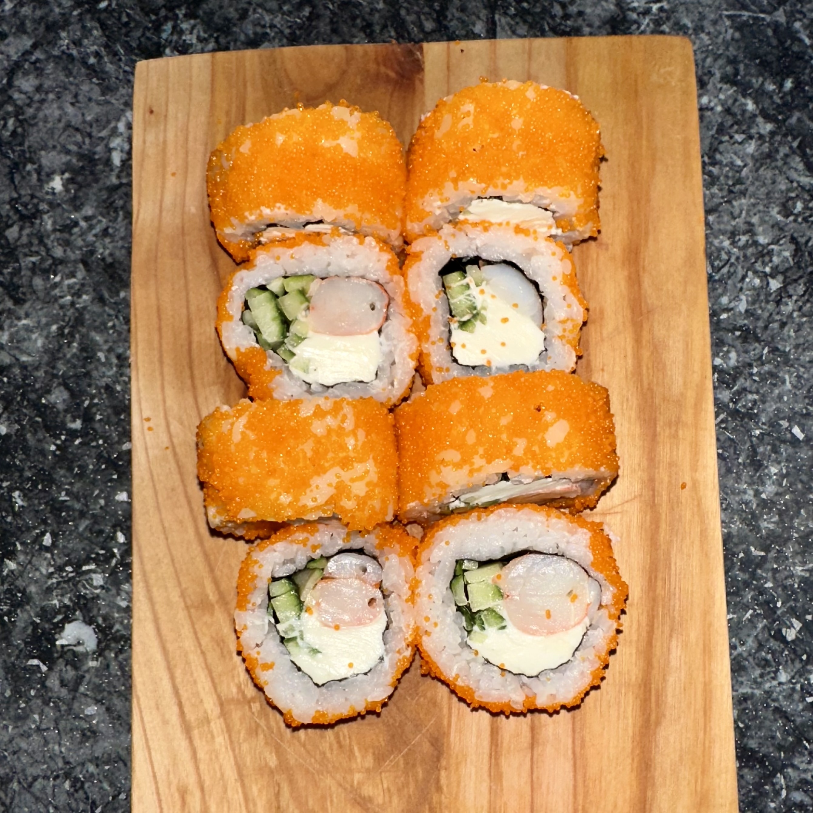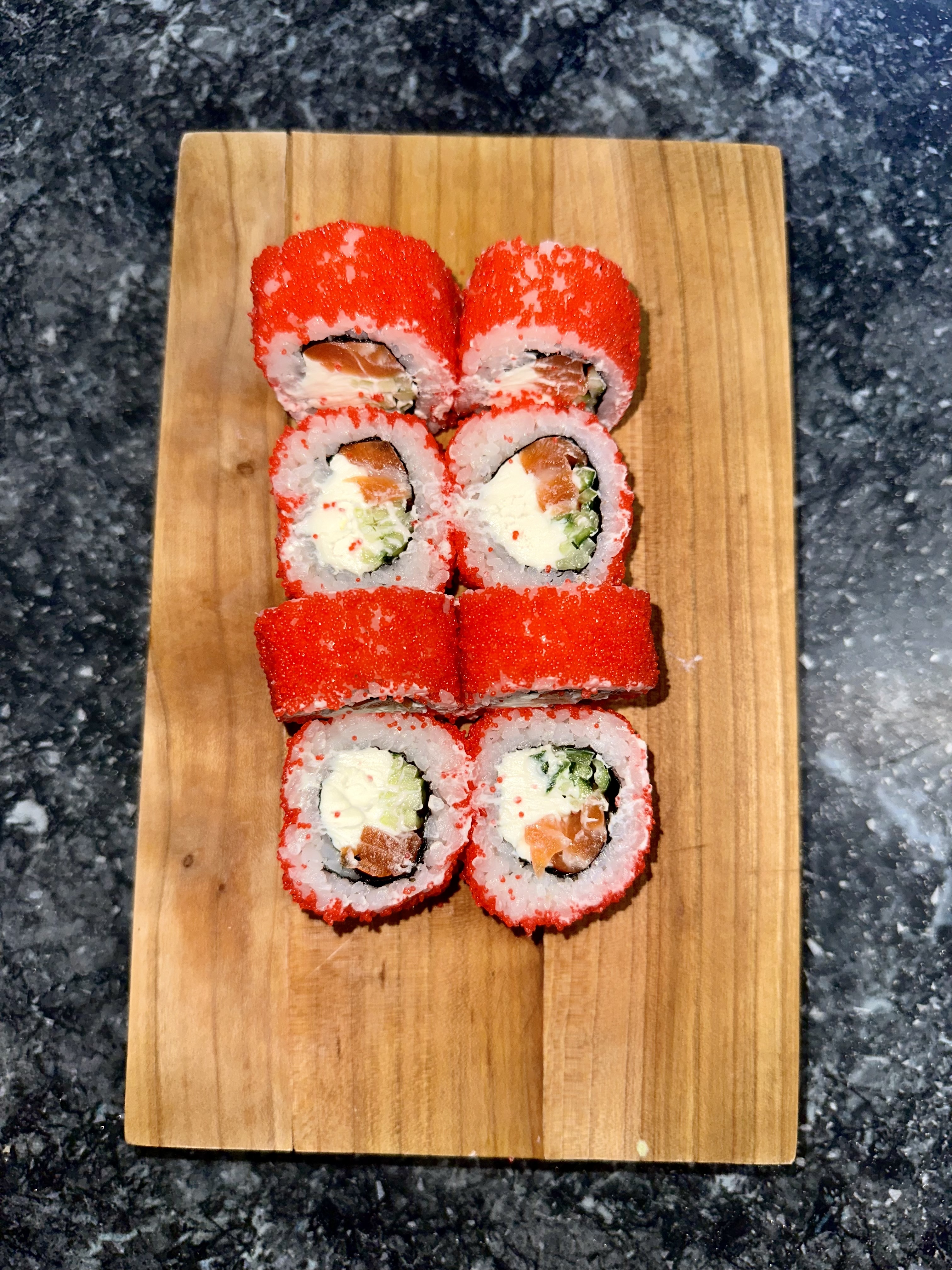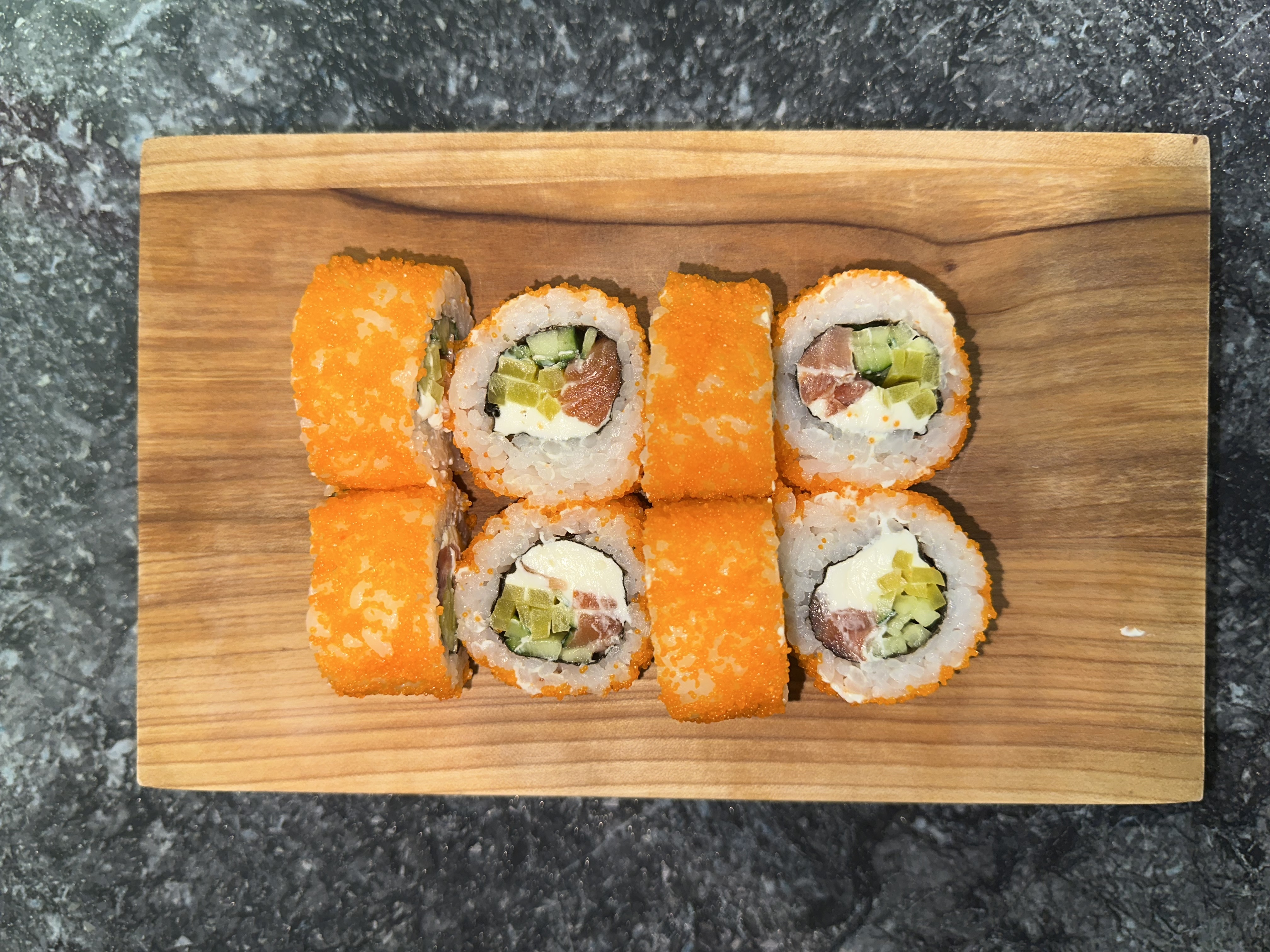Маса: 270г (8шт)Додатково до ролу ви отримаєте набір із імбиру, васабі та соєвого соусу!